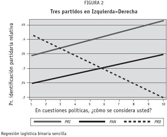 La figura 2 dibuja los datos de los cuadros 15 y 16. La influencia de auto-ubicación de las personas sobre el eje izquierda-derecha en la identificación partidaria relativa es positiva en priistas y panistas. Sus curvas suben conforme el eje se mueve hacia la derecha. En cambio, la curva perredistas se mueve en sentido contrario. Su curva baja a medida que el eje de mueve hacia la derecha. La probabilidad de la constante del PRI es mayor que la del PAN. Eso indica su signo positivo (.3291874). Hay que inferir de ello que, en conjunto, los panistas son menos derechistas que los priistas.