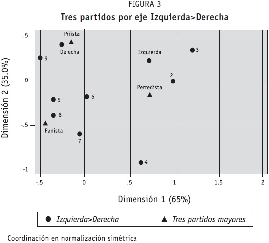 La figura 3 dibuja mejor que su antecesora la relación entre ubicación sobre el eje izquierda-derecha e identificación partidaria. Los panistas están cerca de los valores medios del eje: 5, 6, 7 y 8; los perredistas los están de los valores de la izquierda en ese eje: 1, 2 y 3 y los priistas lo están de los valores situados a la derecha: 9 y 10.