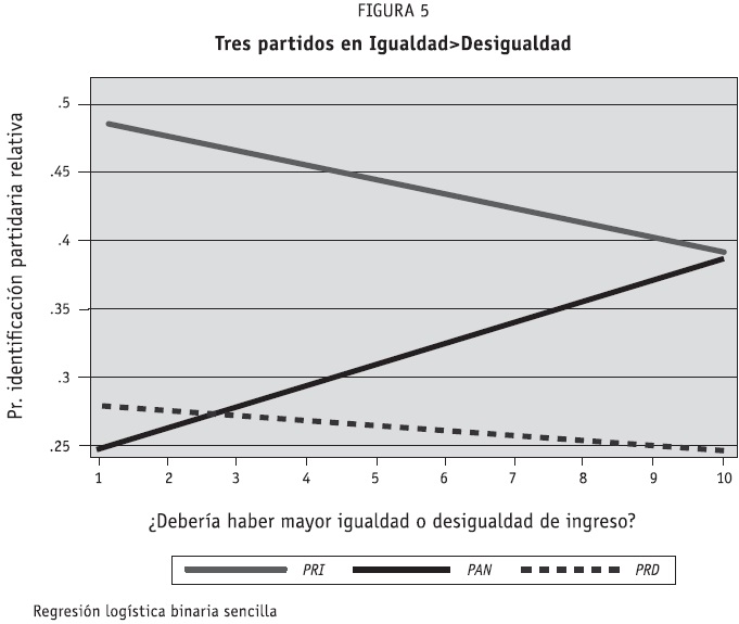 La figura 5 dibuja los datos y las inferencias de los cuadros 17, 18, 19 y 20. El movimiento de la curva del PAN (que parece recta) va a en dirección contraria a las del PRI y del PRD. Esa curva se mueve hacia la desigualdad a medida que aumenta la probabilidad de ser simpatizante del PAN. En los otros partidos, las curvas van al revés: se mueven hacia la igualdad a medida que aumentan sus sendas probabilidades partidarias.