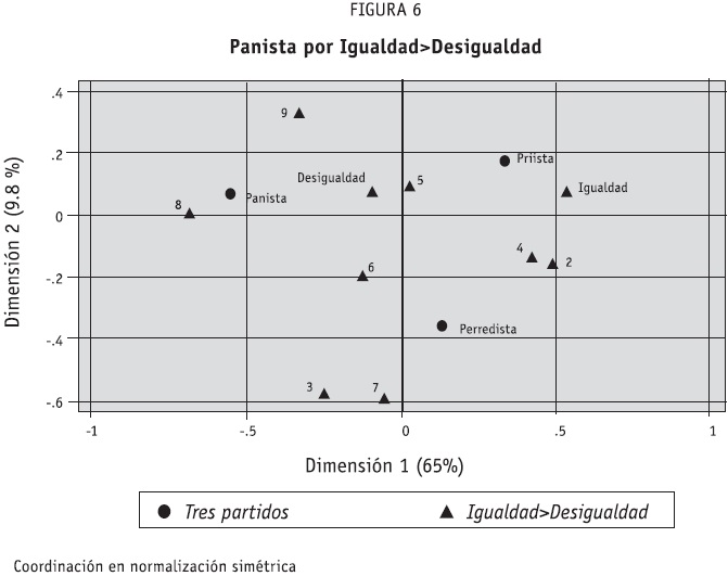 La figura 6 ilustra los datos de los cuatro cuadros y de las dos figuras anteriores. Los panistas están cerca de los valores extremos de la desigualdad (8, 9 y 10), mientras que los priistas (1) y los perredistas (2 y 4), lo están de la igualdad.