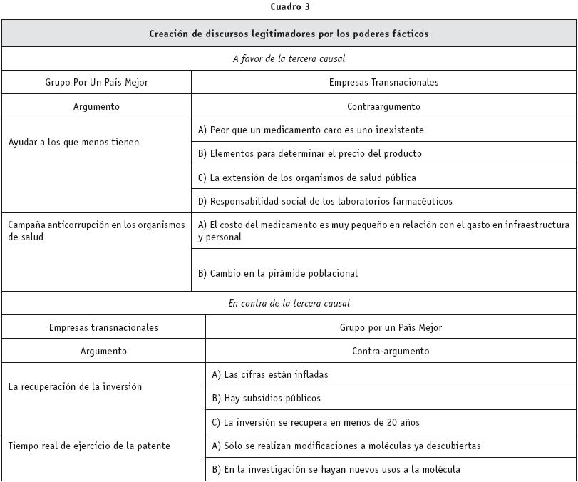 En este mismo sentido, y desde los factores reales de poder, las motivaciones y el conflicto en la toma de decisiones no se presentan ni se resuelven de forma descarnada, también los poderes fácticos generan sus discursos legitimadores. La disputa simbólica se planteó en los siguientes términos: El principal argumento que el GPM elaboró a través de sus tres principales voceros el presidente del grupo, Víctor González Torres, el vicepresidente, Víctor García Lizama y la presidente de Fundación Best y AMMeDeSEF, María del Carmen Villafaña para impulsar la reforma al artículo 77 de la LPI es la existencia de un importante sector poblacional de México en pobreza y pobreza extrema que, por ende, no tiene capacidad para adquirir los medicamentos a altos precios y tampoco cuenta con atención de seguridad social (ayudar a los que menos tienen). Frente a este primer argumento los laboratorios farmacéuticos trasnacionales elaboraron cuatro contraargumentos: A) de aprobarse la reforma se pondría en duda la totalidad del régimen jurídico de la propiedad industrial, lo que ocasionaría que no llegaran los últimos avances de los medicamentos innovadores a México, peor que un medicamento caro es un medicamento inexistente. En este sentido explica Víctor Gómez, directivo de Novartis, que "[...] yo creo que aquí el punto más importante es el acceso a los medicamentos, no el costo de los medicamentos sino el acceso a los medicamentos, o sea, no hay peor medicina que la que no se tiene: para qué vamos a crear una medicina que eventualmente puede ser gratis si no está disponible [....]".36 B) Hay diversos elementos que deben ser tomados en cuenta cuando se estudia si un medicamento es caro o no, en especial se debe considerar el impacto que éste tendrá en la calidad de vida del paciente.37 C) El tercer contraargumento involucra la extensión de la salud pública. En un país como México, donde el 80 por ciento de la población está cubierto por algún tipo de seguro social público, por la propia Secretaría de Salud o por el Seguro Médico Popular, el costo de las medicinas para atender a la población de bajos recursos no es un argumento prioritario.38 D) El cuarto contraargumento se refiere a la propia actividad y responsabilidad social de las instituciones de investigación y desarrollo de medicamentos que en ciertas ocasiones regalan sus medicamentos de punta a poblaciones específicas.39
