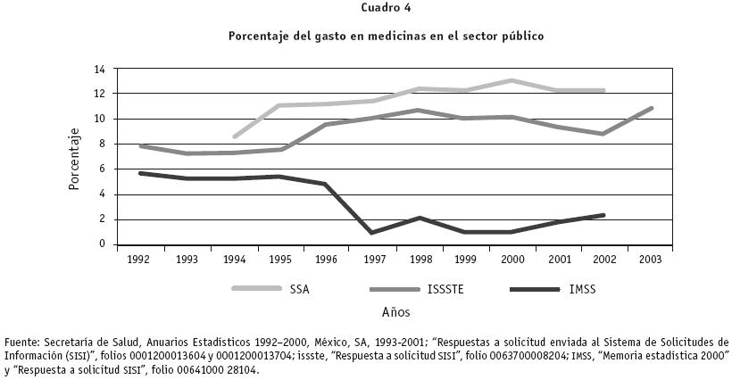 A este segundo argumento recayeron dos contraargumentos de los laboratorios asociados en la Canifarma: 1) en México la pirámide poblacional ha cambiado y se está invirtiendo, tenemos más gente adulta y la esperanza de vida se ha incrementado enormemente por lo que hay más enfermedades crónico degenerativas (como la diabetes, la hipertensión, el cáncer, etcétera.) que requieren más medicamentos por lapsos de tiempo más prolongados41. 2) El costo de los servicios de salud está en toda la infraestructura del sector. El costo de los medicamentos en el costo total del sistema de salud realmente es muy pequeño. En el cuadro 4 (siguiente página) se presenta la compra de medicinas respecto del gasto total.