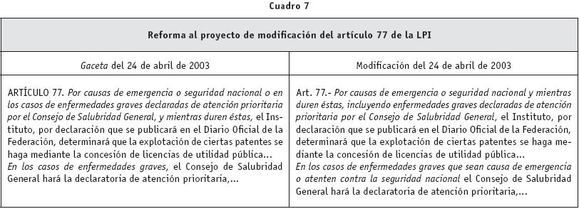 De vuelta a la decisión, luego de haber votado por unanimidad el dictamen en la comisión dictaminadora de la Cámara de Diputados el 25 de marzo de 2003, el 3 de abril del mismo año la mesa directiva de la comisión se reunió con miembros de la Canifarma para conocer la opinión de esta última respecto del dictamen. Pasó un mes sin que se presentara el dictamen, que había sido aprobado de forma unánime, al pleno de la Cámara. Finalmente, el 24 de abril de 2003 se publicó el texto analizado en la Gaceta Parlamentaria y se dio la primera lectura del proyecto en el pleno de la Cámara de Diputados. Sin embargo, ese mismo día se celebró una reunión extraordinaria de la Comisión de Ciencia y Tecnología para reformar el dictamen. Esta modificación cambio totalmente el sentido de la reforma planteada al artículo 77 de la LPI, las enfermedades graves declaradas de atención prioritaria dejaron de ser una causal autónoma de otorgamiento de licencias públicas para subrogarse a los casos de emergencia o seguridad nacional, hecho de imposible realización en las enfermedades que se buscaba atacar con la reforma ya que tanto el VIH/SIDA como el cáncer y las demás enfermedades crónicas son males de avance progresivo por lo que una persona puede sobrevivir varios años después de la aparición de la enfermedad. Obsérvese el comparativo: