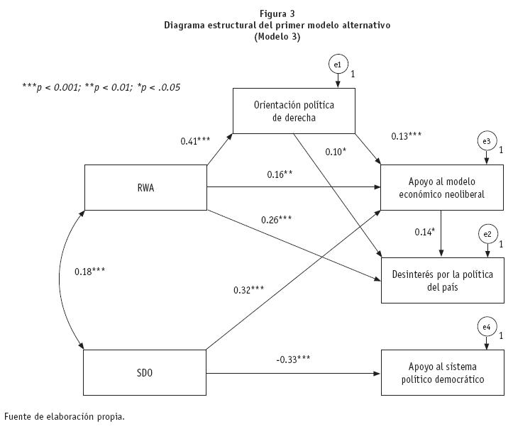 Una investigación meta-analítica apoya esta propuesta, en la medida en que buena parte de las investigaciones que este estudio revisó utilizaron escalas de RWA o SDO (o ambas) como medidas de conservadurismo político.56 Sobre la base de este estudio, la propuesta de Jost, denominada conservadurismo político como cognición social motivada, intenta describir la estructura motivacional que predispone a los individuos a adherirse a ideologías políticas conservadoras. En este modelo teórico, la expresión del conservadurismo coincide con las dos dimensiones que permiten distinguir entre derecha e izquierda: la justificación de la inequidad y la resistencia al cambio. En el contexto peruano, a partir del enfoque dual y el modelo conceptual del conservadurismo como cognición social motivada, Rottenbacher, Espinosa y Magallanes, a través de un modelo de ecuaciones estructurales, hallaron que la intolerancia a la incertidumbre y a la ambigüedad ejercía un efecto sobre los niveles de RWA y SDO, mientras que el RWA ejercía una influencia directa sobre la orientación política de derecha. Esto permite proponer que el enfoque dual de la ideología política y la propuesta teórica de John T. Jost son aplicables en algunos contextos urbanos de América Latina.57