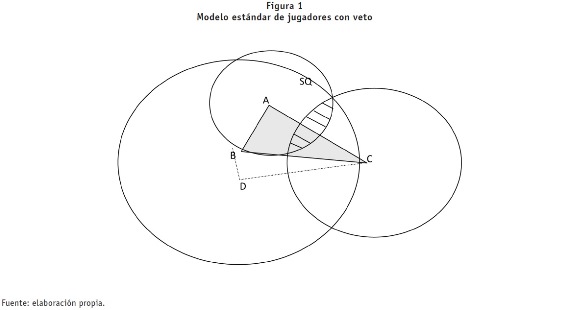 El modelo se presenta en la figura 1, misma que muestra tres jugadores con veto (A, B y c) cuyos puntos preferidos de política se encuentran ubicados en el plano marcados por las letras respectivas.