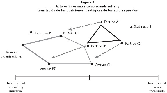 La presentación del modelo de jugadores con veto antes descrita, permite avanzar en la posibilidad de incluir actores informales en la determinación de las políticas de gasto público. Es posible retomar tres aspectos planteados por el modelo de Tsebelis que resultan útiles para verificar la capacidad de modificar el statu quo de la política de gasto social: la cantidad de actores con veto, la distancia ideológica entre ellos y la posibilidad de algún jugador de fijar la agenda.