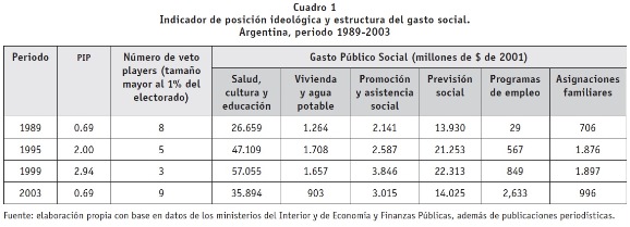 En el cuadro se aprecia que el ítem de gasto público social que aumentó significativamente es el que corresponde a Programas de Empleo, que es el aspecto central de los reclamos de las organizaciones de desocupados que aparecieron en escena luego de 1998.38 A su vez, este cambio en el statu quo se corresponde con la reducción significativa del índice de posición ideológica promedio (pasó de 2.94 a 0.69), lo que da cuenta de un 'corrimiento a la izquierda' del universo de jugadores con veto en lo que atañe al gasto público.