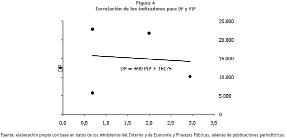 En la figura 4 se evidencian los resultados del análisis de correlación entre el PIP y la DP. Puede observarse que no existe una correlación negativa muy fuerte para el caso de estos índices, lo cual indica que deberían buscarse otros determinantes de los cambios en la política de gasto público social en la post-convertibilidad.