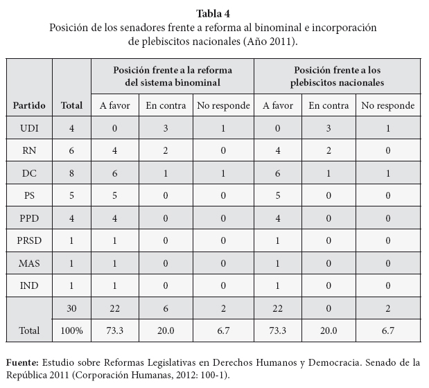 En enero del 2012 la oposición entregó al gobierno una propuesta que reemplazaba el actual binominal por un sistema "proporcional moderado". Tal como se había señalado un año antes, la propuesta apuntaba a mejorar los criterios de asignación de los cupos y cargos de representación, además del aumento de éstos mismos. Ésta, que fue entregada por los presidentes del PDC, del PS y el PPD, fue antecedida por otra formulada por el PDC y RN que no solamente modificaba el binominal sino que a su vez planteaba la necesidad de establecer un régimen semipresidencial (Larraín y Walker, 2012). La crítica formulada por la UDI a un posible acuerdo entre RN y el PDC llevó al gobierno a definir la necesidad de discutir cualquier propuesta al interior del oficialismo previo a cualquier paso.17 En tal sentido, la disposición a la reforma manifestada por parlamentarios de RN, contrastó con la posición adoptada por el Presidente de la República y por el conjunto de los parlamentarios pertenecientes a la UDI.18