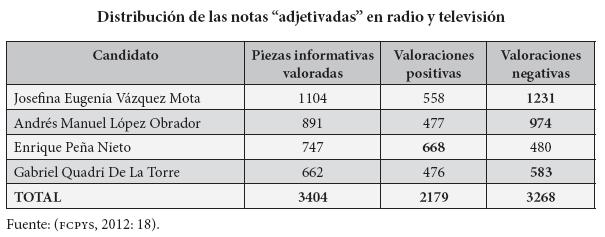 Asimismo, si el lector profundiza en el análisis del informe final, se da cuenta de otros datos sugerentes. Por ejemplo, dentro del universo de "valoraciones" reconocidas, existe un fuerte sesgo a favor de Peña Nieto y en contra de López Obrador y Josefina Vázquez Mota. Presentamos a continuación la tabla correspondiente del informe que resume la distribución de todas las notas "adjetivadas" en radio y televisión:
