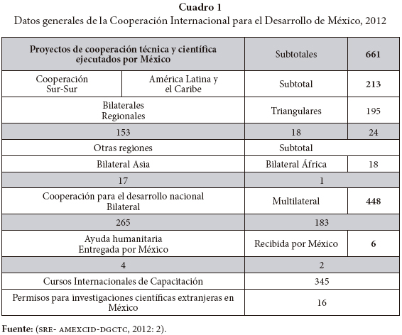 Antes de continuar con el análisis de las acciones mexicanas de colaboración, resulta necesario hacer una precisión. Como un efecto del déficit de institucionalización de sus procesos, acciones y resultados, las autoridades mexicanas adscritas a la Secretaría de Relaciones Exteriores (SRE) dedicadas a gestionar esta tarea no han logrado que los informes oficiales que editan cada año contengan análisis comparables entre sí. Por otro lado, en los datos referidos no se incluye la totalidad de ejercicios de CID del país, sino que se incluye únicamente el ámbito de la cooperación técnica, científica, ayuda humanitaria (y en algunos casos educativa) realizada mediante el respaldo de la Dirección General de Cooperación Técnica y Científica (DGCTC); instancia adscrita desde noviembre de 2011 a la AMEXCID.