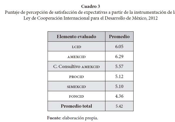 Ahondando en el análisis sobre el proceso de mejora de la CID mexicana, y con base en los referidos postulados institucionalistas de las Relaciones Internaciones tendientes a analizar a la cooperación desde la perspectiva del estudio de la aplicación de normas, instituciones, así como del estado de percepción sobre la satisfacción de las expectativas generadas en la aplicación de tales normas e instituciones (Krasner, 1983: 2), y dado que prácticamente no existen estudios sobre percepciones sobre la CID en los países del Sur (Mawdsley, 2012: 104), en el marco de esta investigación se aplicó una encuesta sobre percepción de satisfacción de expectativas al amparo de la instrumentación de la LCID, en el año 2012 a los tres principales actores de la cooperación mexicana, los cuales fueron funcionarios AMEXCID, funcionarios adscritos a oficinas dedicadas a Relaciones Internacionales de secretarías de Estado, así como académicos dedicados al análisis de dicha actividad.23