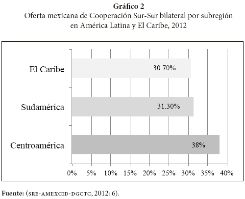 En el ámbito de la CSS, de los 153 proyectos bilaterales llevados a cabo en Latinoamérica y El Caribe por instituciones mexicanas en 2012, 58 se instrumentaron en Centroamérica (38%). Sudamérica fue beneficiada con 48 proyectos (31,3%), y El Caribe registró 47 proyectos (30,7%).8 Ello revela que, como ha sido la constante desde la década de los setenta, Centroamérica continúa teniendo una posición prioritaria para la cooperación mexicana, en estricto apego a los propósitos de política exterior trazados por el gobierno federal (Ibíd. 2013).