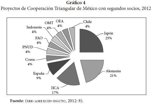 Otra característica particular que engendra la cooperación mexicana es su evidente propensión hacia la práctica de la cooperación triangular, marco de actuación en donde en el año 2012 se realizaron 24 proyectos bajo esta dinámica; un incremento del 100% respecto al año anterior. La entidades socias, tal y como se señala en el siguiente cuadro, fueron Japón, Alemania, el Instituto Interamericano de Cooperación para la Agricultura (IICA), España, Corea, el Programa de las Naciones Unidas para el Desarrollo (PNUD), la Organización de las Naciones Unidas para la Agricultura y la Alimentación (FAO), Indonesia, la Organización Mundial del Turismo (OMT), la Organización de los Estados Americanos (OEA) y Chile. Los beneficiarios fueron Bolivia, Colombia, Ecuador, Paraguay, Perú, Haití, Guatemala, Santa Lucía, El Salvador, Honduras, y en el rubro de proyectos regionales, Mesoamérica y Centroamérica.