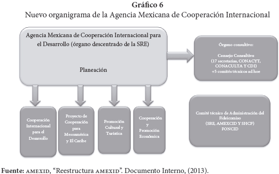 Es decir, la administración de Calderón -ya sea por una actitud reactante respecto al mandato legislativo de crear a la Agencia, por la coyuntura en términos del paulatino ocaso del período presidencial, por la complejidad misma de su implementación, la citada restricción presupuestal, o debido a una mezcla de estos y otros factores-, no generó una renovada estructura a favor de una más acabada institucionalidad, reflejada en el organigrama de la AMEXCID, heredando tal ejercicio a la presidencia de Enrique Peña Nieto.
