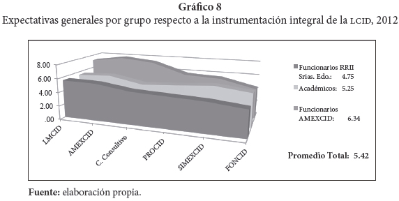 Para identificar con mayor precisión las posibilidades generadas a este respeto tras 18 meses de la entrada en vigor de la multicitada Ley, la encuesta de percepciones aplicada a los grupos poblacionales más relacionados con el tema (funcionaros AMEXID, funcionarios adscritos a oficinas de asuntos internacionales de varias secretarías de Estado y académicos dedicados al estudio de la CID de México) al amparo de esta investigación generó como resultado un promedio general de 5.42 sobre 10.