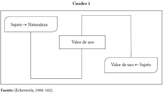 Echeverría reconoce en el concepto de valor de uso empleado por Carlos Marx una crítica radical a la economía capitalista, crítica que precede y determina la concepción que el mismo Marx tenía sobre su opuesto contradictorio: el valor de cambio, ser para la valorización. Dicha concepción teórica es implícita y "sostiene todo el edificio de la crítica de la economía política" (Echeverría, 1998, 155).