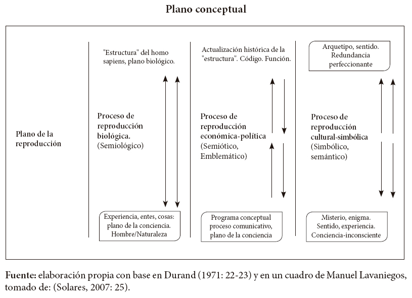 De manera que podemos decir que junto al proceso de reproducción social basado en la producción de valores de uso, producción/consumo, y paralelo al proceso de reproducción semiótico independiente, comunicación/interpretación, existe un proceso de simbolización, que alude a una dimensión simbólica de la existencia humana, representación/simbolización. Se trata no sólo de la reproducción de una forma económica-política sino al mismo tiempo de la reproducción y la representación de una forma cultural y de un imaginario cultural, que se forjan entre las necesidades biopsíquicas del ser humano y su interacción con el medio cósmico y social. El ser humano, entonces, produce valores de uso para su subsistencia biológica y al mismo tiempo reproduce una forma política; produce una comunicación e interpreta su relación con el mundo; interpreta y comunica no sólo con signos directos o adecuados, sino también con símbolos y significados indirectos. El ser humano produce objetos para su subsistencia, y a su vez, crea un lenguaje y un universo de signos y símbolos que dan sentido a su producción y por lo tanto a su existencia. Desde esta perspectiva sociológica, filosófica y antropológica, la creación de valores de uso remite, al menos, a un triple proceso de reproducción: 1) biológico, 2) económico-político y 3) cultural-simbólico (ver plano conceptual).