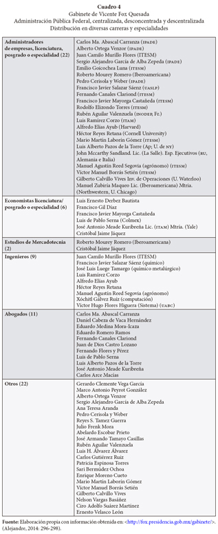 La disposición del gabinete y colaboradores en diferentes carteras durante el gobierno de Vicente Fox muestra marcadas diferencias con los gabinetes de los últimos tres presidentes priístas. De manera evidente, hay una ruptura con la élite política anterior enmarcada en la línea tecnócrata, y la instalación de una clase política gobernante con formaciones académicas con una proporción mayor centrada en estudios ajenos al Derecho y la Economía. La élite se tornó empresarial.17