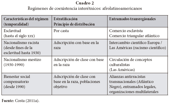 La especificación de estos cuatro regímenes de coexistencia presenta una configuración transregional de la desigualdad en su forma actual, sin pasar por alto su historicidad.36 Además, este acercamiento facilita la descripción y el análisis de los entramados transregionales y de las características nacionales (las distintas características del mestizaje, las diversas políticas compensatorias, etcétera).