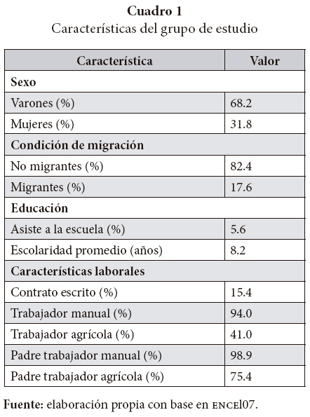 En el cuadro 1 se muestran algunas características del grupo de estudio. Además de la distribución por sexo y condición de migración, se observa que 5.6% de los jóvenes estudian simultáneamente y que alcanzan, en promedio, 8 años de escolaridad. Asimismo, se constata el carácter precario de sus ocupaciones, así como de su origen social. Casi 8 de cada 10 jóvenes proviene de un hogar cuyo jefe es trabajador agrícola, es decir, se ubican en el peldaño más bajo de la jerarquía ocupacional. Entre los jóvenes, la participación en actividades agrícolas se reduce casi a la mitad, pero quienes laboran en empleos distintos a los de sus padres lo hacen en su mayoría en ocupaciones manuales que significan movilidad ascendente de corta distancia. Sólo 6% de ellos están involucrados en trabajos no manuales. Cabe destacar que las cifras aquí presentadas esconden la heterogeneidad existente en el grupo dentro del cual se encuentran jóvenes con primaria incompleta y otros que han concluido la educación superior, así como aquellos que son trabajadores agrícolas y otros que se desempeñan como profesionistas.