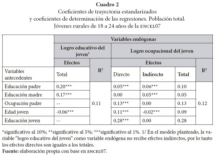 El modelo analítico y los coeficientes estandarizados que resultan de las dos regresiones se muestran en la figura 2. Dichos coeficientes indican el peso de cada sendero en el modelo y permiten conocer su importancia relativa. En el cuadro 2 se reportan los efectos directos (que corresponden a los representados en la figura), los indirectos y los totales de las distintas variables antecedentes sobre la educación y la ocupación del joven.