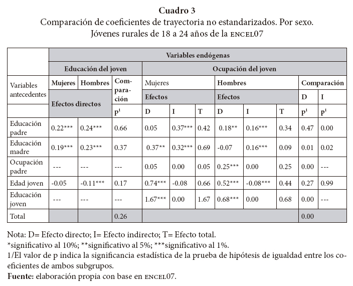 La figura 3 y el cuadro 3 muestran los coeficientes no estandarizados de los senderos para ambos sexos, los cuales permiten comparar entre los subgrupos la magnitud de los efectos de cada variable antecedente sobre las variables endógenas y, particularmente, sobre la variable final. El valor p en el cuadro 3 (y en el cuadro 5) indica si los coeficientes específicos o el conjunto total de coeficientes son estadísticamente distintos entre los subgrupos.