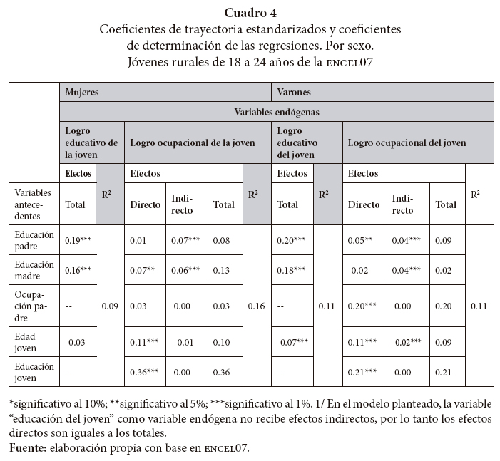 El cuadro 4 presenta para mujeres y varones los efectos directos, indirectos y totales estandarizados de las variables antecedentes sobre las endógenas, lo cual hace posible comparar el peso relativo de cada variable al interior de cada subgrupo. También se presentan los coeficientes de determinación de las dos regresiones para los subgrupos.