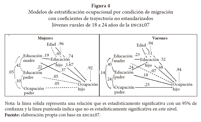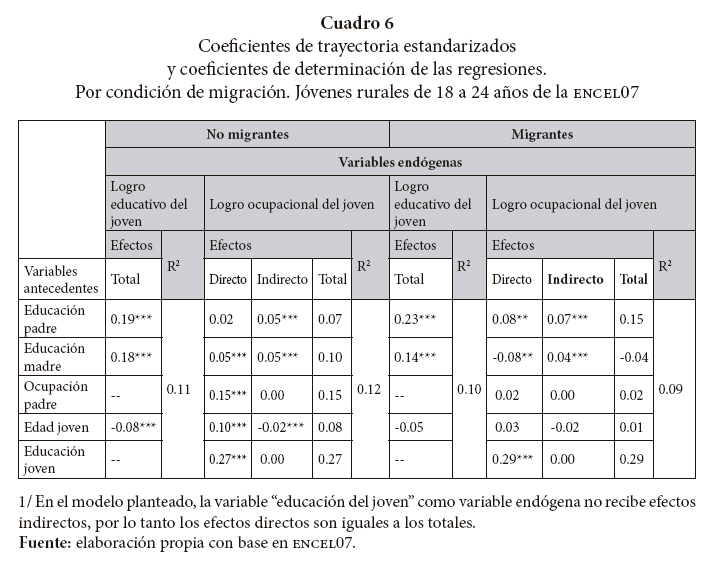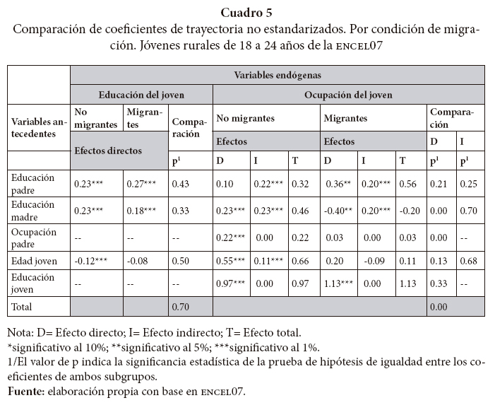 Las diferencias de coeficientes específicos entre estos subgrupos ocurren únicamente en los vínculos directos entre variables antecedentes y el estatus ocupacional de los jóvenes. Como se muestra en el cuadro 5, el efecto directo de la educación de la madre y de la ocupación del padre sobre el estatus ocupacional del joven son estadísticamente diferentes entre no migrantes y migrantes. La incidencia de ambas variables de origen es más fuerte sobre los no migrantes.