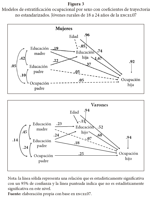 Como se podrá observar en las figuras del siguiente apartado, los modelos analíticos que se utilizan en este estudio incluyen seis variables: educación de la madre, educación del padre, ocupación del padre, edad actual del joven (o hijo), educación y ocupación actual.10 Los modelos podrían mejorarse con la incorporación de otros factores que la bibliografía teórica y empírica ha destacado como relevantes en la explicación del logro ocupacional pero, desafortunadamente, la información con la que se cuenta no permite su inclusión.