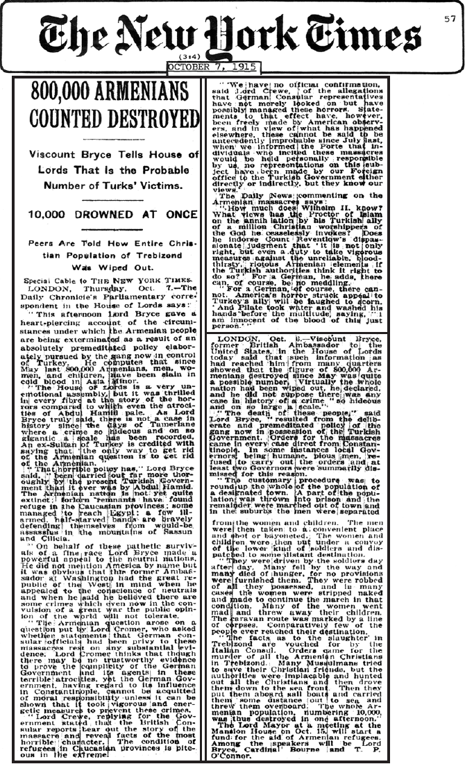 El populacho kurdo y turco que mató a los armenios estaba indudablemente motivado por razones religiosas, pero los que verdaderamente concibieron el crimen no tenían tal móvil. Casi todos eran ateos sin ningún respeto por el mahometanismo o el cristianismo; para ellos el único móvil era el Estado, frío y calculador (Memorias del embajador estadounidense Henry Morgenthau, 1919: 47-48).
