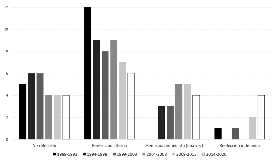 Esa situación comenzó a cambiar en 1993. Alberto Fujimori en Perú modificó la constitución e introdujo la figura de la reelección presidencial, que le permitió un segundo periodo de gobierno en 1995 y, posteriormente, en el año 2000, a través de una ley aprobada por su bancada mayoritaria en el Congreso, forzó una nueva reelección. Poco después, en 1995 en Argentina, Carlos Menem también consiguió modificar la constitución que le permitiría reelegirse. De la misma forma, Fernando Henrique Cardoso lo lograría al reformar la constitución brasileña en 1997 y reelegirse el año siguiente. A esos afanes reformadores reeleccionistas le seguirían después Chávez en Venezuela, Uribe en Colombia, Correa en Ecuador y Evo Morales en Bolivia; el panorama al respecto en la región cambió. A fines de la década de 2010, ocho países permitían la reelección inmediata por una o más veces, seis la reelección alterna y solo cuatro la prohibían completamente. ¿Cuáles han sido los efectos del cambio de esa regla sobre la democracia? Esta pregunta aún no ha sido respondida. Los estudios que abordan el tema son principalmente teóricos y descriptivos, y aquellos que buscan algún tipo de explicación suelen colocar a la reelección como variable dependiente.