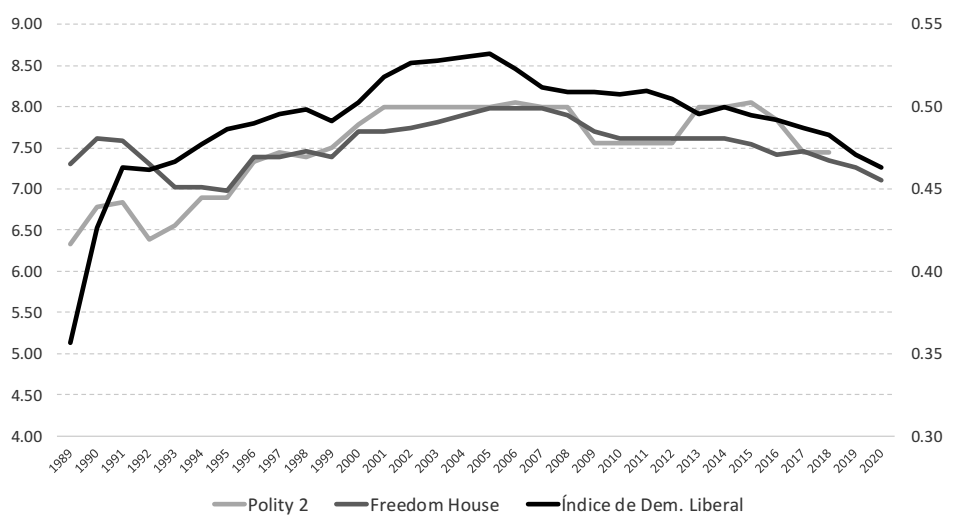 Fuente: elaboración propia con datos de Polity 5, Freedom House y Varieties of democracy.