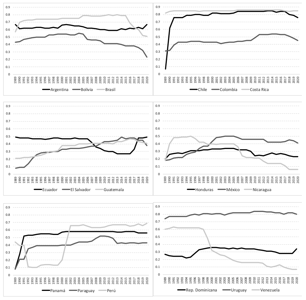 Gráfica 3 Democracia en América Latina 1989-2020, por países (orden alfabético)12