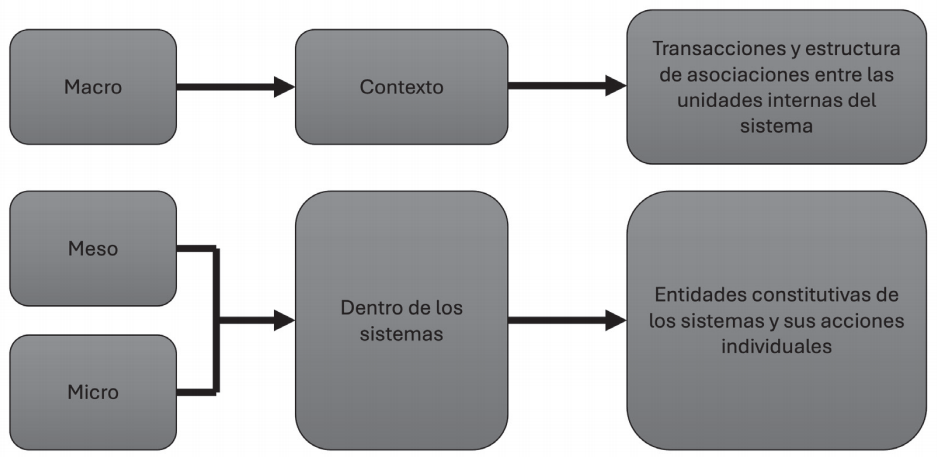 2) Meso: que ocurre a nivel interno del sistema entre sus unidades y viene referido a su estructura de asociaciones y transacciones. Explica la dinámica interna del sistema.