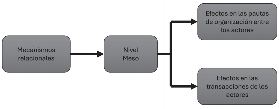 En tercer lugar, los mecanismos causales de tipo relacional, que operan a nivel de organización meso, se relacionan con las pautas de organización y las transacciones que mantienen los actores sociales. Se dan dentro de los sistemas en los procesos de organización, tal y como podemos observar en la siguiente figura.