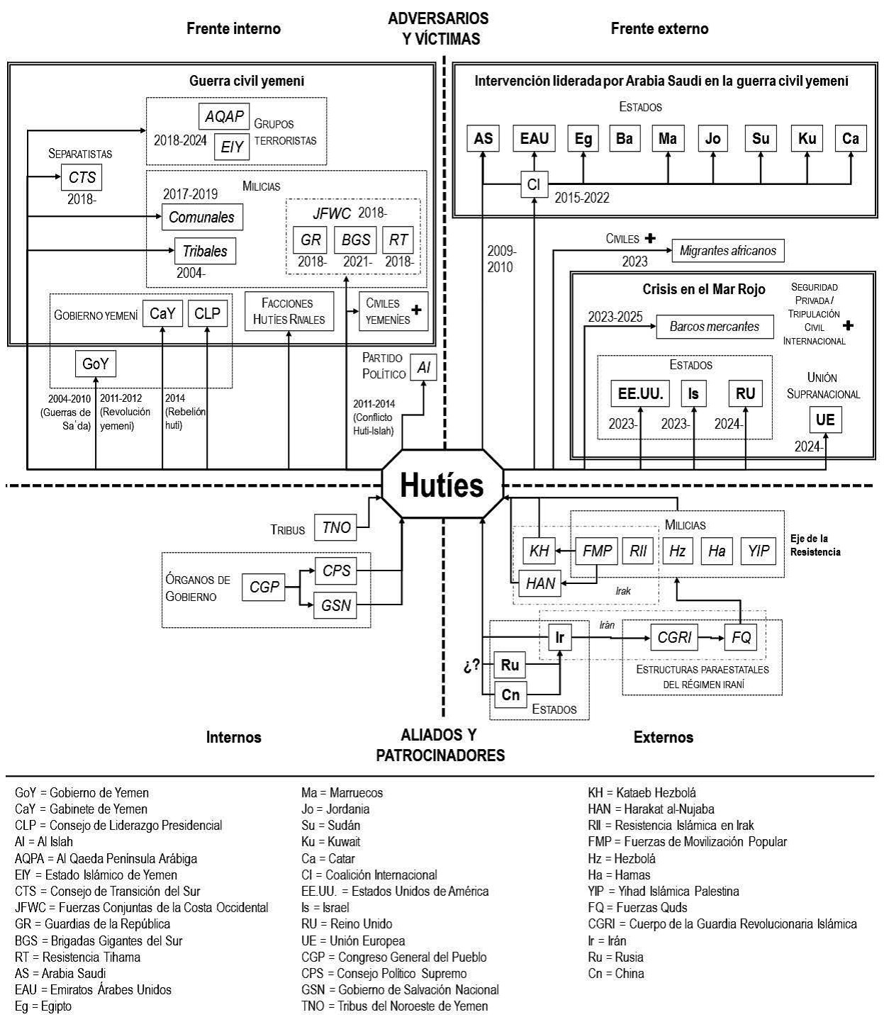 Al mismo tiempo, los hutíes combatían en Amran a las tribus aliadas del partido Al Islah (AI), salafista y cercano a los Hermanos Musulmanes (Bonnefoy, 2024). Se impusieron sobre ai en julio de 2014 (Policy Analysis Unit, 2014). La llamada Rebelión Hutí (batalla de Saná) en septiembre de 2014 duró apenas cinco días. Los hutíes capitalizaron las protestas por la eliminación de subsidios al combustible para imponerse sobre Hadi, quien dimitió. Los hutíes lo arrestaron y reemplazaron las instituciones estatales por un comité revolucionario. Hadi escapó a Adén y volvió a proclamarse presidente. La porción del ejército leal a los hutíes avanzó hacia Adén, pero retrocedió por el inicio de los bombardeos de la Coalición Internacional (CI). Habían comenzado, casi simultáneamente, la Guerra Civil yemení y la intervención de la CI (Lackner, 2023). La Figura 1 organiza la posición de los hutíes en relación con cuatro cuadrantes: adversarios y víctimas internas, adversarios y víctimas externas, aliados internos y aliados externos.