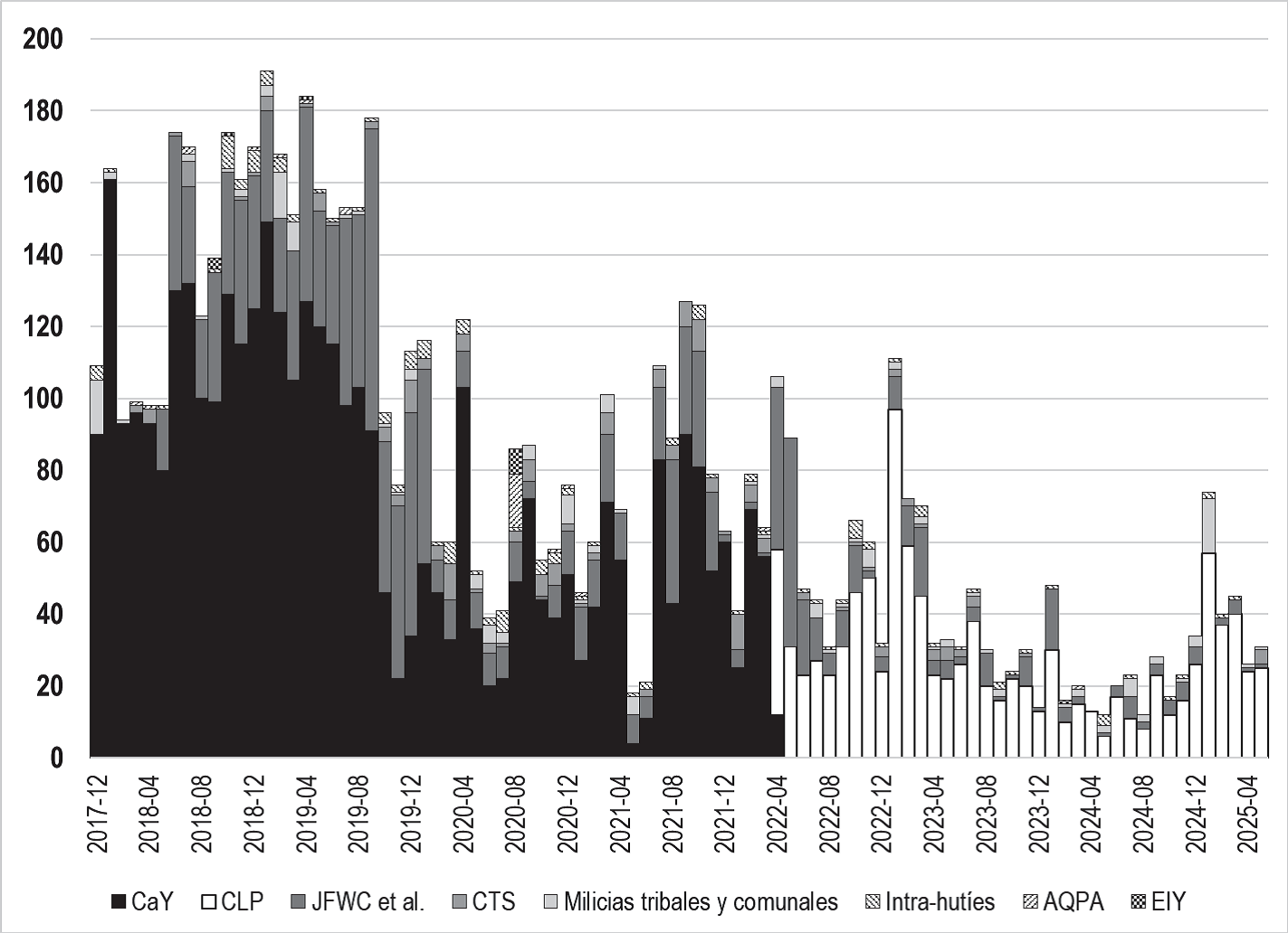 Los análisis sobre la guerra entre los hutíes y sus rivales internos son escasos y poco sistemáticos. El análisis que sigue es propio, a menos que se citen otras fuentes, y se basa en los registros de Armed Conflict Location & Event Data Project (ACLED, s.f.a) que involucran a los hutíes entre diciembre de 2017 y mayo de 2025. En dicho período, los hutíes protagonizaron 7 004 enfrentamientos armados contra adversarios internos. El pico se alcanzó en 2019 con 1 771 batallas, seguido de una tendencia descendente: 515 en 2023 y 266 en 2024. En los primeros cinco meses de 2025 ya se han registrado 216 enfrentamientos, lo que podría indicar un repunte. La mayoría de estas batallas fue contra el gir, primero en su versión de cay (56 %) y, desde 2022, contra su sucesor, el Consejo de Liderazgo Presidencial (CLP) (15 %). Otros frentes importantes han sido las Fuerzas Conjuntas de la Costa Occidental (JFWC) (21 %), el cts (2.6 %) y diversos actores menores como AQPA, el Estado Islámico de Yemen (EIY), milicias tribales y facciones disidentes hutíes (véase gráfica 1).