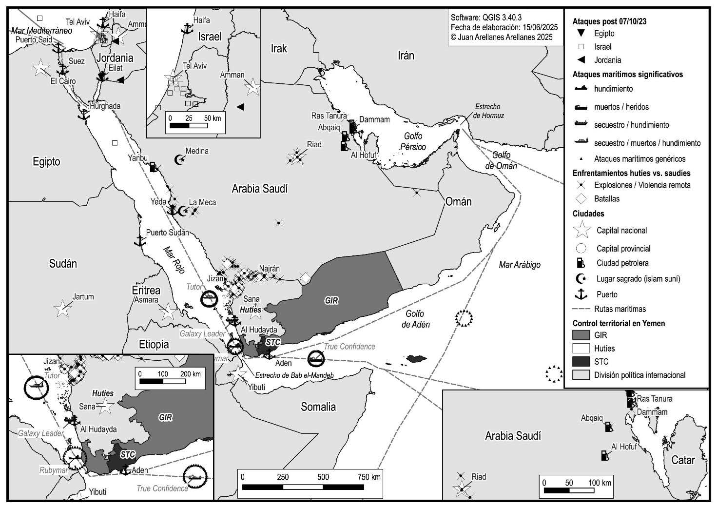 Aunque se le ha llamado “Crisis del Mar Rojo” al conflicto entre los hutíes y Occidente a partir del 7 de octubre de 2023, la crisis se extiende desde Israel, Egipto y Jordania, por el Mar Rojo y el estrecho de Bab el-Mandeb hasta el Golfo de Adén y el Mar Arábigo.