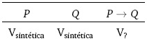 Si "verdadero" es ambiguo entre verdad analítica y verdad sintética, ¿qué significa "V" en esa tabla? Podríamos intentar añadirle suscritos: Vanalítica y Vsintética; de acuerdo con ello, multiplicaríamos las posibilidades en las dos primeras columnas y añadiríamos el suscrito apropiado en la tercera columna. "F" también requeriría suscritos correspondientes. Puesto que las posibilidades Vanalítica , Vsintética, Fanalítica y Fsintética surgen tanto para P como para Q, la nueva tabla de verdad tendrá dieciséis líneas. Pero considérese este caso: