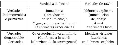 (i) Verdades de razón (veritates rationis, vérités de raison ou a priori) y verdades de hecho (veritates facti, vérités de fait ou a posteriori);