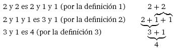 En lugar de decir que 2 y 2 es 2 y 1 y 1, podía haber puesto que 2 y 2 es igual a 2 y 1 y 1, y así con todo lo demás. Pero también se puede subentenderlo en todos los pasos, para hacerlo con más rapidez, y ello en virtud de otro axioma que lleva consigo que una cosa es igual a sí misma, o que lo que es lo mismo es igual. (NE IV 7 § 10)
