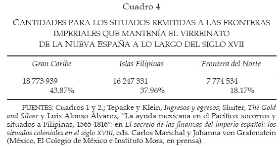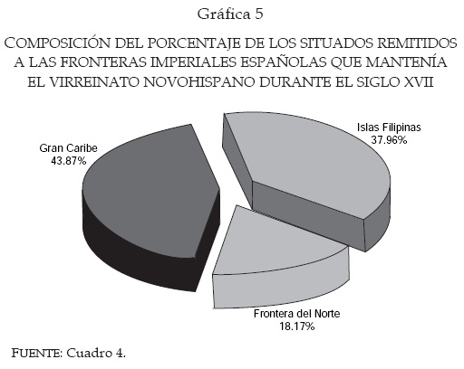Finalmente, al reunir los gastos para los situados de todas las fronteras que mantenía la Nueva España, resulta que a lo largo del siglo XVII casi un 22 °% del total de los egresos de la caja real de México se asignó al financiamiento de los presidios en el Circuncaribe, las Filipinas y el Norte.