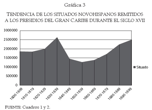 En cambio, el nivel más alto se presentó en la última década de la centuria cuando las remesas para los situados representaron 90.62 % de los envíos a la metrópoli. Es probable que ello fuera resultado de la guerra contra Francia, lo que provocó la descomposición del sistema de flotas y la disminución de las remisiones a España, y por otro lado, el aumento de los situados en los presidios grancaribeños, sobre todo para Santo Domingo debido a la presencia francesa en la banda noroccidental de la isla Española. Hay que decir que en el periodo comprendido entre 1690 y 1699, dicho presidio obtuvo casi el 30 % del total de los situados grancaribeños.