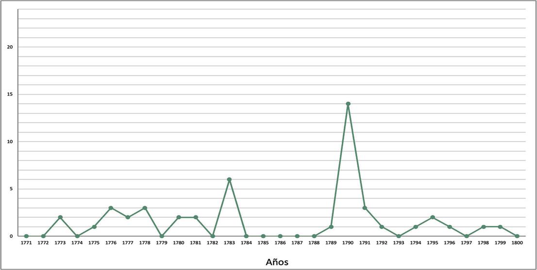 Mientras que en el norte la situación mejoraba, en el centro-sur la renuencia de los aborígenes no desfallecía. Una ola de más de cinco ataques aconteció entre 1784 y 1785; las hostilidades se prolongaron hasta 1786. Este periodo fue uno de los más notorios de la resistencia, ya que los alzamientos y ataques cubrieron un amplio territorio. A los padecimientos experimentados por los radicados en Horcasitas se sumaron los de Croix, Santillana, Escandón, Llera, Santa Bárbara, Tula, Palmillas y los Infantes.64 En agosto de 1784 los inapanames y bocaprietas abandonaron Santillana y atacaron un rancho; feneció un vaquero. Al siguiente año, los indígenas del capitán Guadalajara desertaron del poblado de Croix, ejecutaron algunos robos y quitaron la vida a vaqueros y pobladores de la zona.65 El cabildo y justicias de las villas aseveraron que las hostilidades de los aborígenes llegaron a otras jurisdicciones, como Matehuala, ubicada al suroeste.66 De nueva cuenta, la enigmática sierra de Tamaulipa la Vieja fue el punto neurálgico de la tenacidad nativa. Desde ese bastión los insumisos caían sobre las citadas poblaciones. La gráfica 1 devela el incremento notorio y explosivo del fenómeno. Tras pocos años de relativa calma, los focos de alarma de nueva cuenta se encendieron en 1789 cuando los janambres, de los grupos indígenas más renuentes de antaño, desertaron de la misión de Llera, como ya fue referido. Se procedió a sofocar el alzamiento apoyándose en fuertes campañas militares ejecutadas por el capitán Juan María Murgier. Este hecho marcaría el fin del periodo más efervescente y el declive de las acciones de rechazo indígena del fenómeno en la parte central de la provincia, situación que se volvería más evidente en la década siguiente.