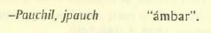 Como se puede apreciar, los términos usados para designarlo son idénticos en ambas lenguas. Cabe mencionar al respecto que entre los yacimientos más importantes de esta resina fósil, localizados en la región de Simojovel, existe uno conocido como Cerro Pabuchil o "Cerro del ámbar", y otro llamado Jolpabuchil. del tzotzil jol, "cabeza, fuente, cima", y pabuchil. "ámbar", es decir, "la cabeza o fuente del ámbar" (Blom, 1959: 26).