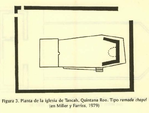 Pero los primeros frailes de inmediato se dan cuenta de la imperiosa necesidad de adaptarse a unas necesidades culturales y ambientales muy precisas, diferentes a las que estaban acostumbrados. Este cambio de perspectiva o capacidad de adaptación al entorno puede observarse en el templo de Tancah (Miller y Farriss. 1979; Andrews, op. cit.). Más acorde con el tradicional culto al aire libre, se trata de evitar espacios cubiertos y limitados por muros envolventes, sean de bajareque o manipostería (figura 3).