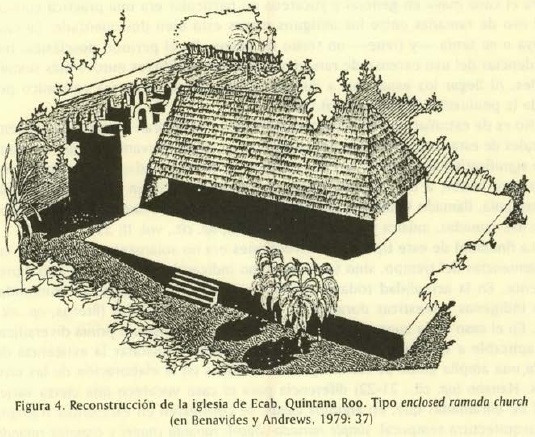 En el interior de esta categoría de iglesias pueden observarse dos estadios de desarrollo más o menos contemporáneos. Uno de ellos, característico de las tierras mayas, en cierto modo se relaciona con una provocada "involución" de los templos al aire libre con enramada. En realidad no es una forma arquitectónica desconocida, su novedad consiste en delimitar con un muro de bajareque, adobe o mampostería la enramada de los templos al aire libre. La cubierta sigue siendo de zacate o guano sobre una estructura de madera que descansa directamente en los muros laterales si es que éstos son de adobe reforzado o mampostería. Cuando todavía son de bajareque, la cubierta descansa sobre hileras de horcones. Andrews identifica este tipo de construcciones con el nombre de Enclosed Ramada Church (op. cit.: 368) (figura 4).13