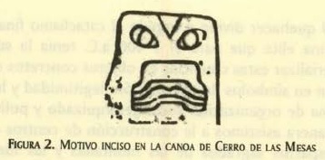 La canoa de Cerro de las Mesas ha sido reproducida en varias publicaciones especializadas y de divulgación. Fue grabada en ambos extremos con una deidad bicéfala cuya característica sobresaliente es la abertura en "v" de la frente; la representación de esta deidad no es inusual en la iconografía olmeca, sin embargo es bastante raro hallar su imagen bicéfala (Canoa 1 de la figura 1). Estos motivos incisos de los extremos de la canoa son la típica cara olmeca de ojos rasgados y boca "atigrada", con hendidura en "v" sobre la frente.