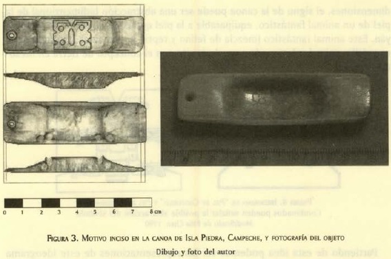 La canoa de Campeche es de menor tamaño (mide 7.8 cm de largo) y su materia prima es jade verde azulado; tiene un ideograma al centro de la pieza, el cual aparece en diversos monumentos y objetos procedentes de los más importantes sitios olmecas, como San Lorenzo, La Venta, Tonalá, Arroyo Pesquero y San José Mogote (Canoa 2 de la figura 1). Esta canoa tiene un signo inciso un tanto más misterioso, pero mucho más representado en el arte olmeca. El signo, grabado en el centro, está compuesto por un perímetro con cinco hendiduras y en el medio se hallan cuatro círculos dispuestos en un cuadro y una barra, además de una especie de cejas sobre cada uno de los círculos (figura 3).